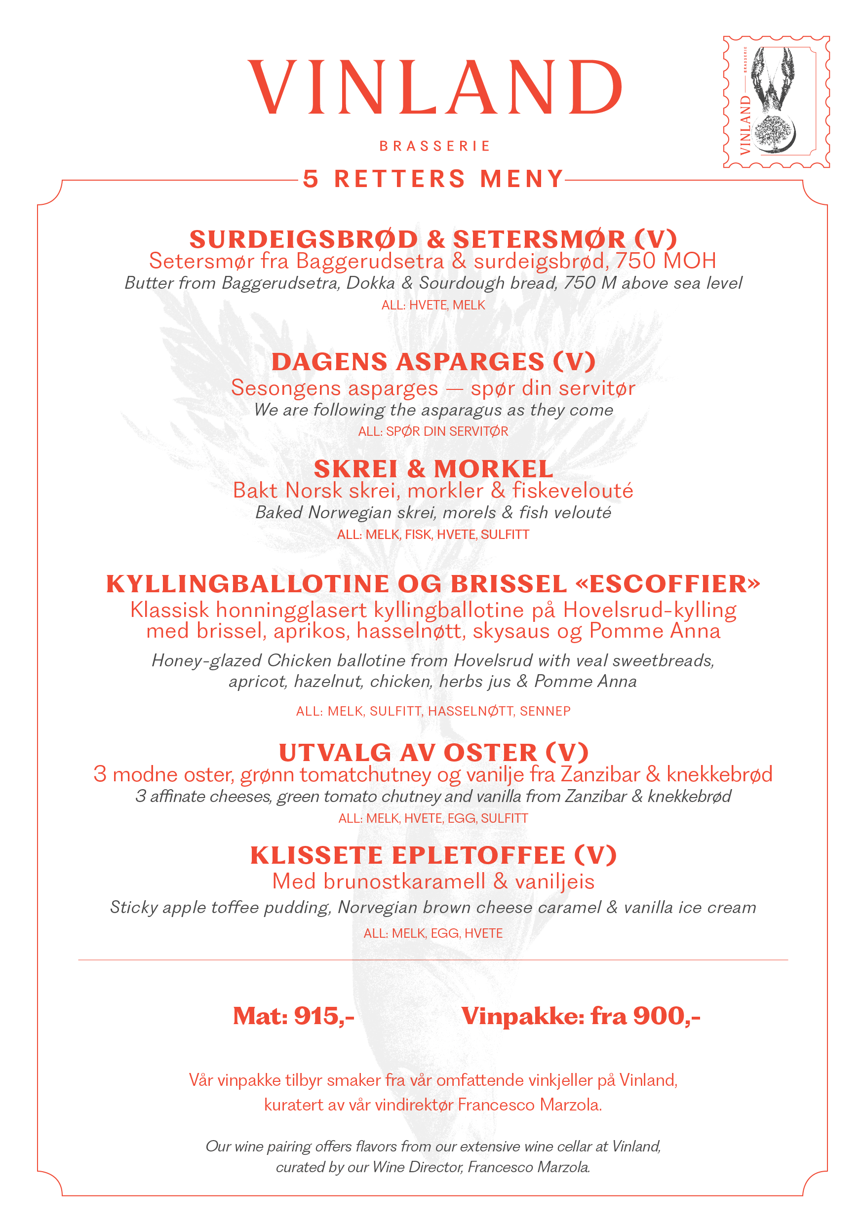 Ta kontakt på restaurant@vinlandbrasserie.no